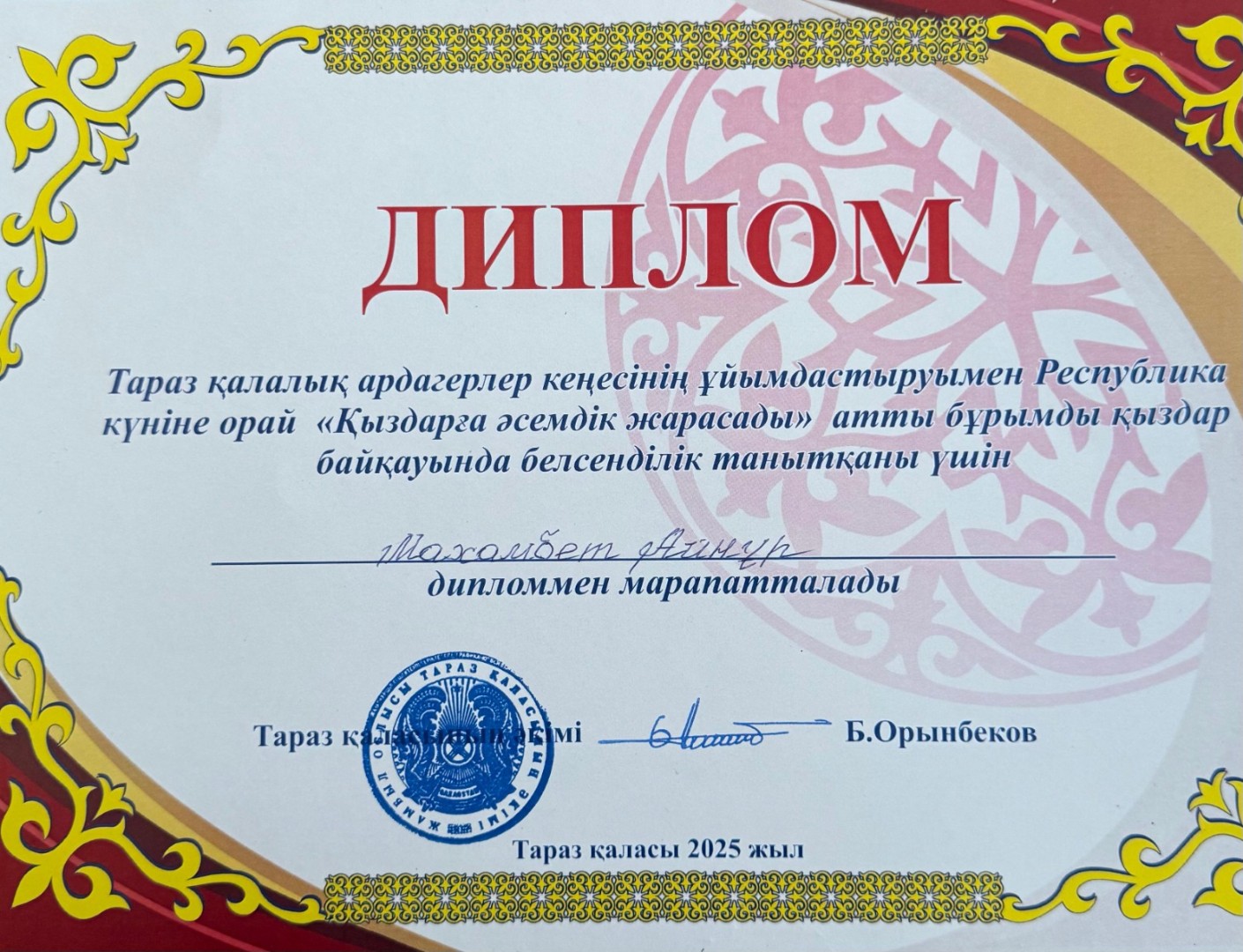 По инициативе Городского совета ветеранов города Тараз в честь Дня Республики был проведён конкурс среди девушек с косами под названием «Қыздарға әсемдік жарасады». В конкурсе активное участие приняла студентка 1 курса отделения «Дошкольное воспитание» Жамбылского гуманитарного высшего колледжа имени Абая — Махамбет Айнур, за что была награждена дипломом.